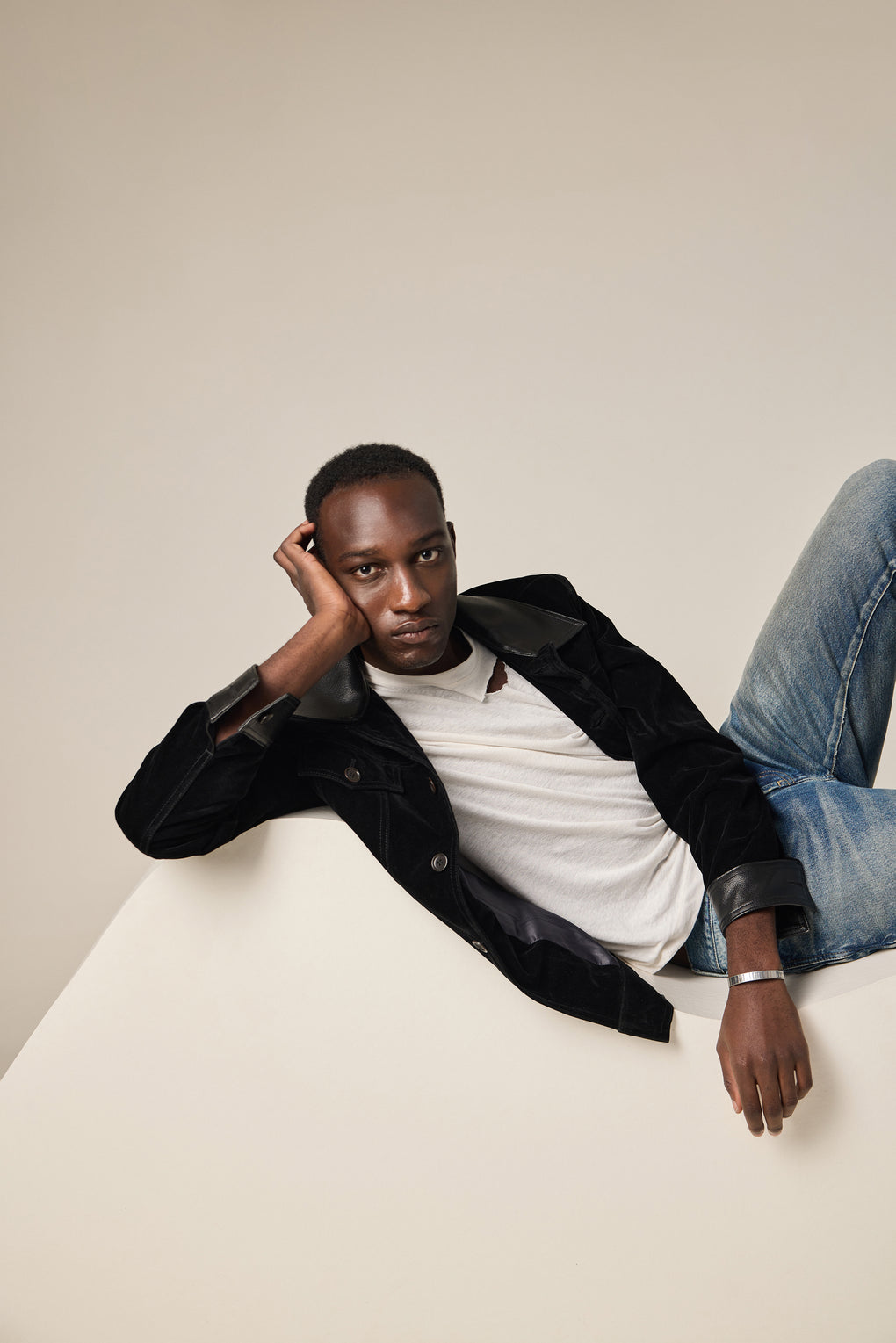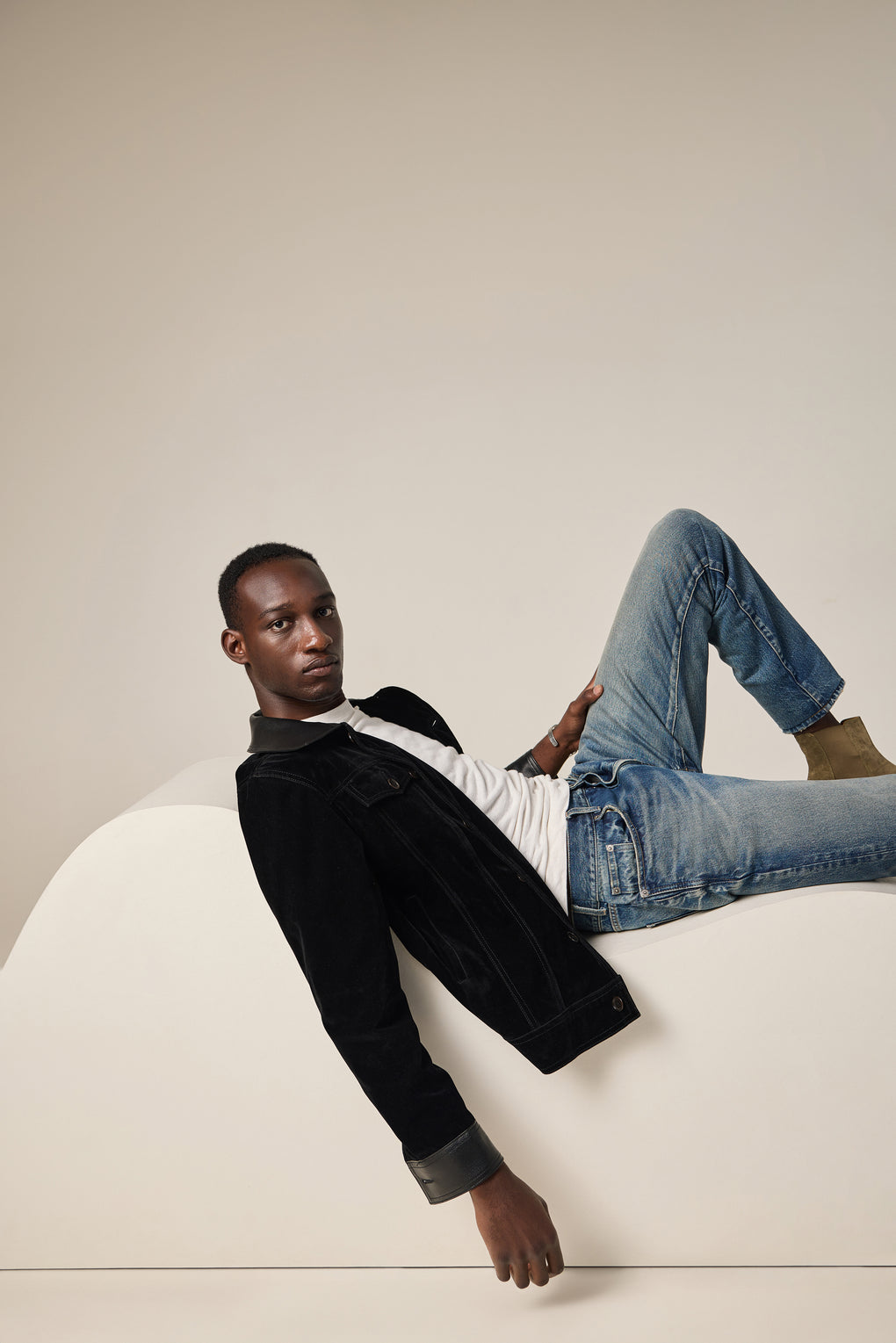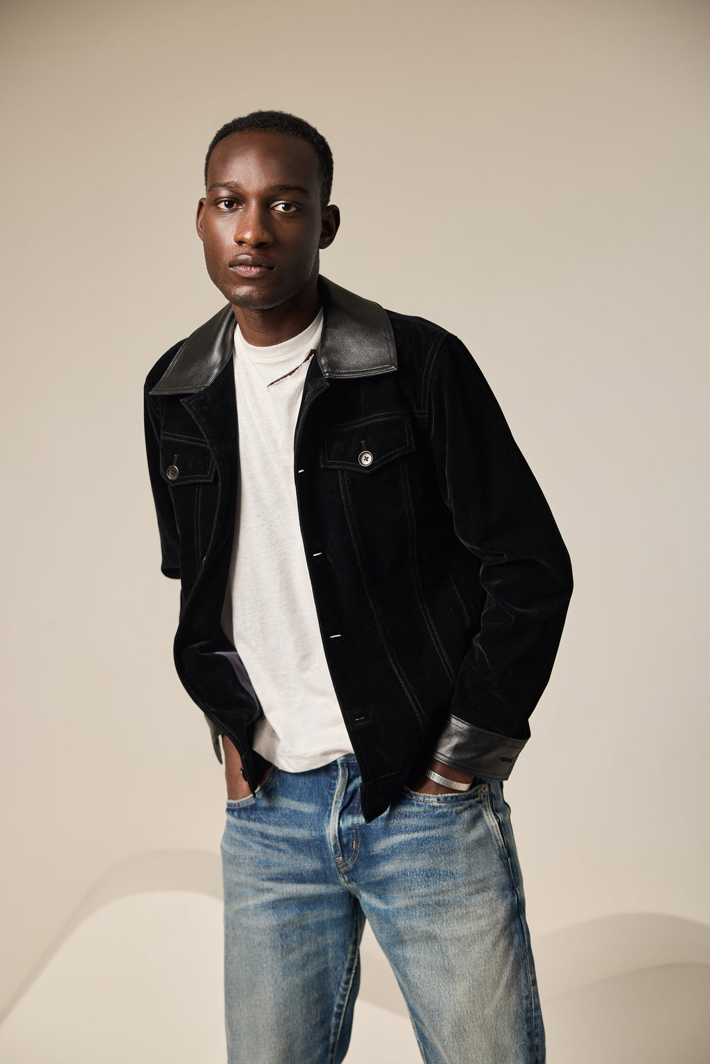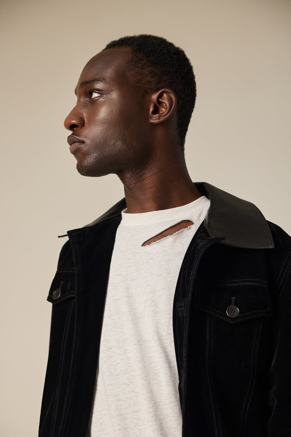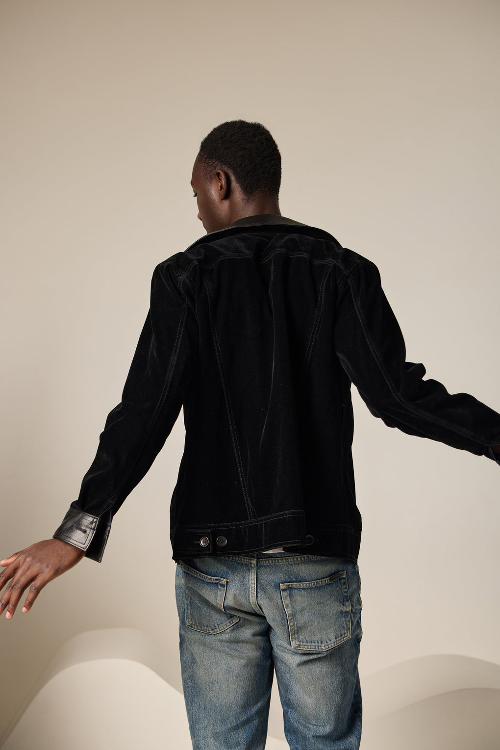 perlo studios' black velvet trucker jacket is detailed with a leather collar & cuff and finished with mop buttons. one size fits all full sleeve regular fit unisex color : black |
