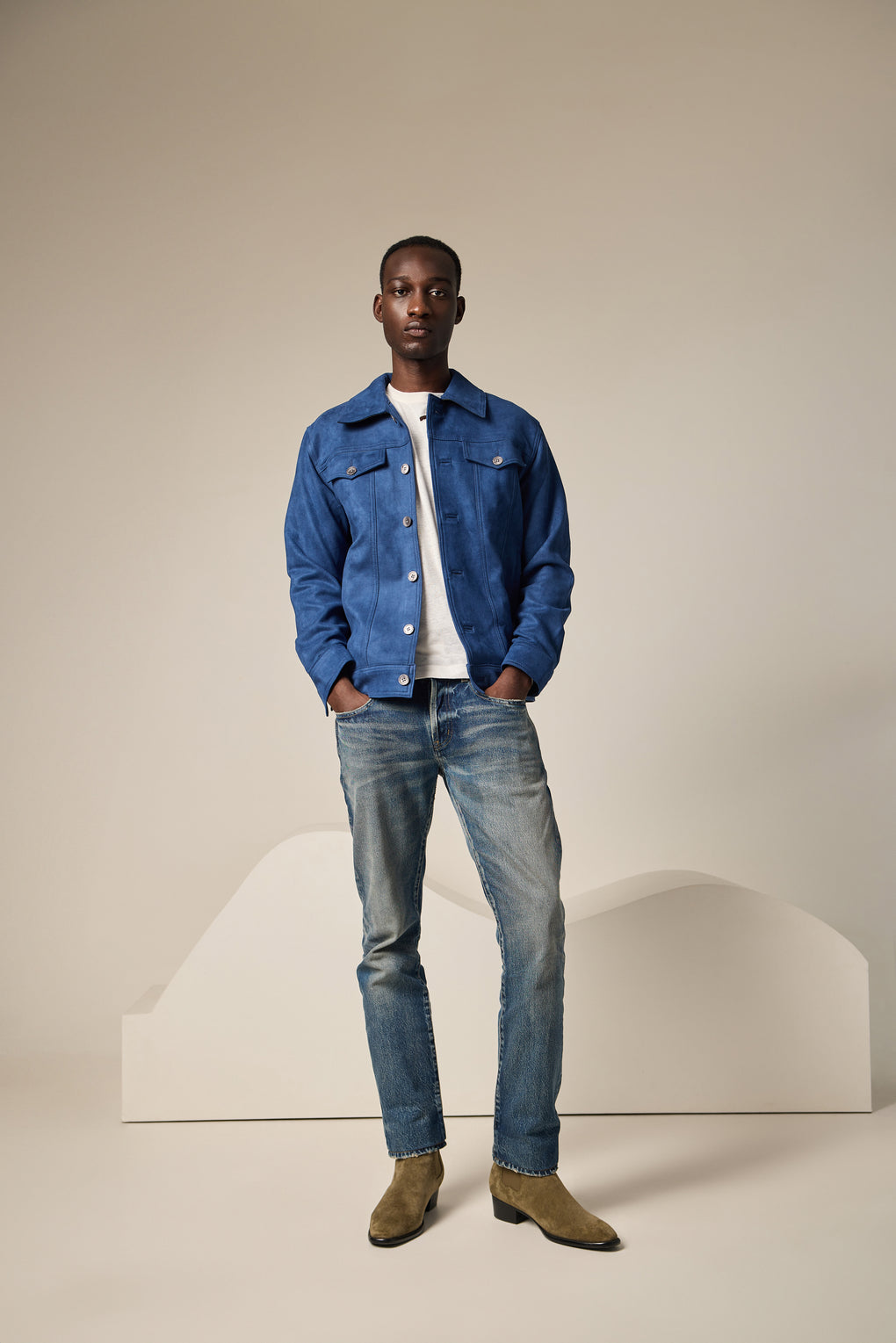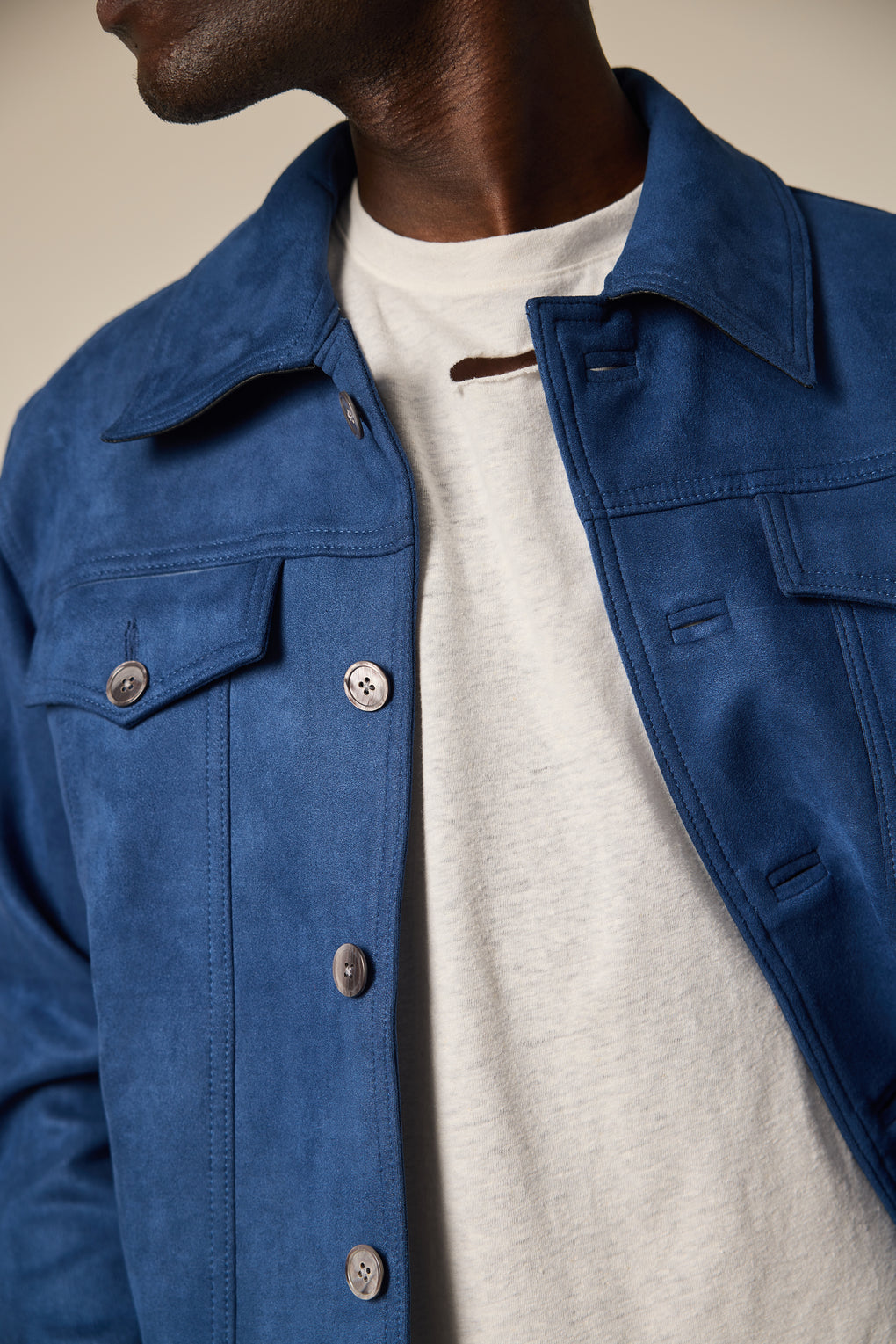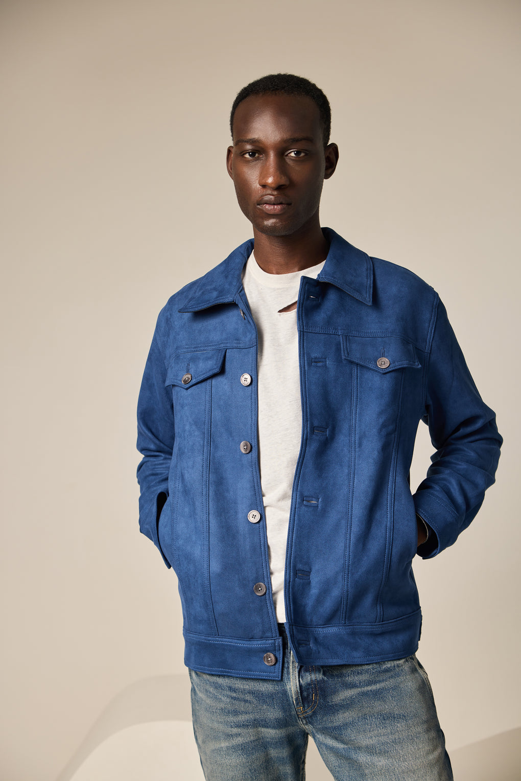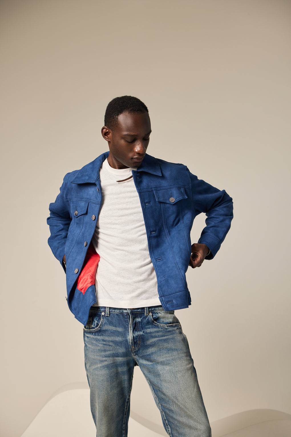 perlo studios' blue suede trucker jacket is detailed with a red inner lining and finished with mop buttons. one size fits all full sleeve regular fit unisex color : blue |