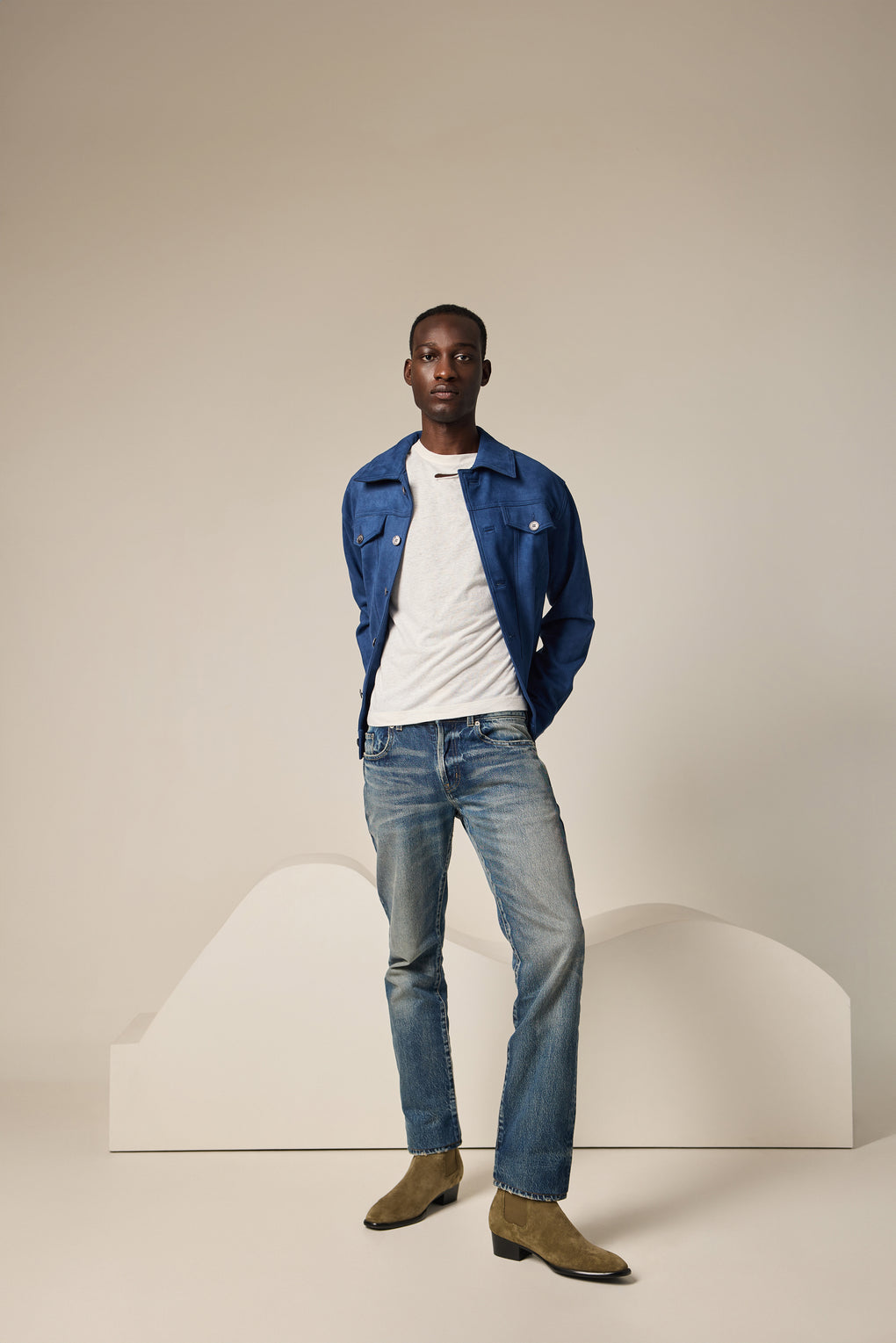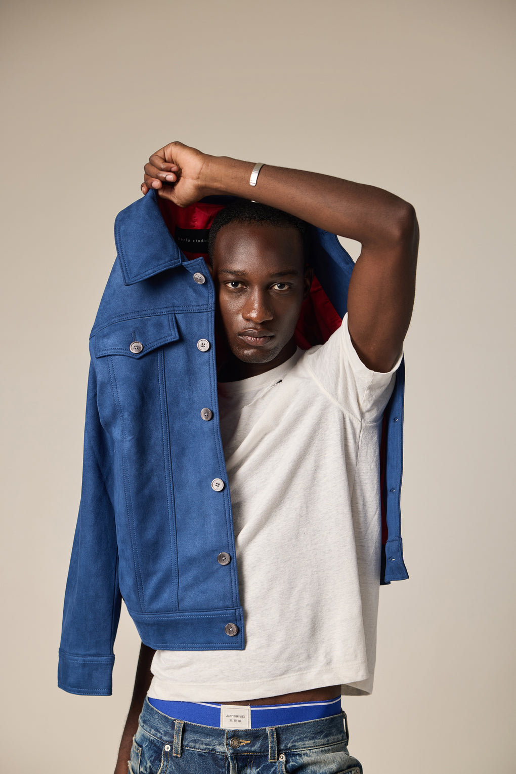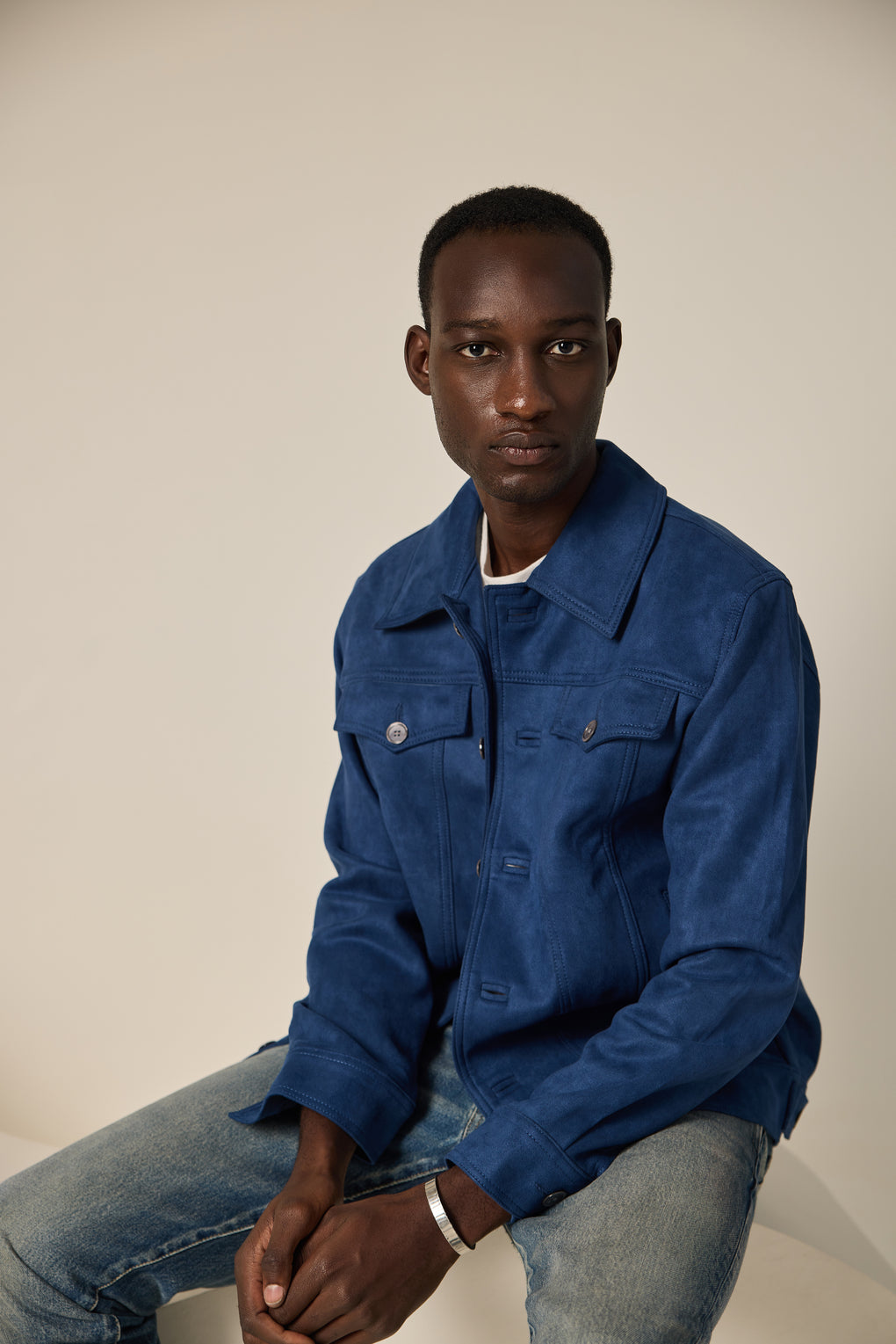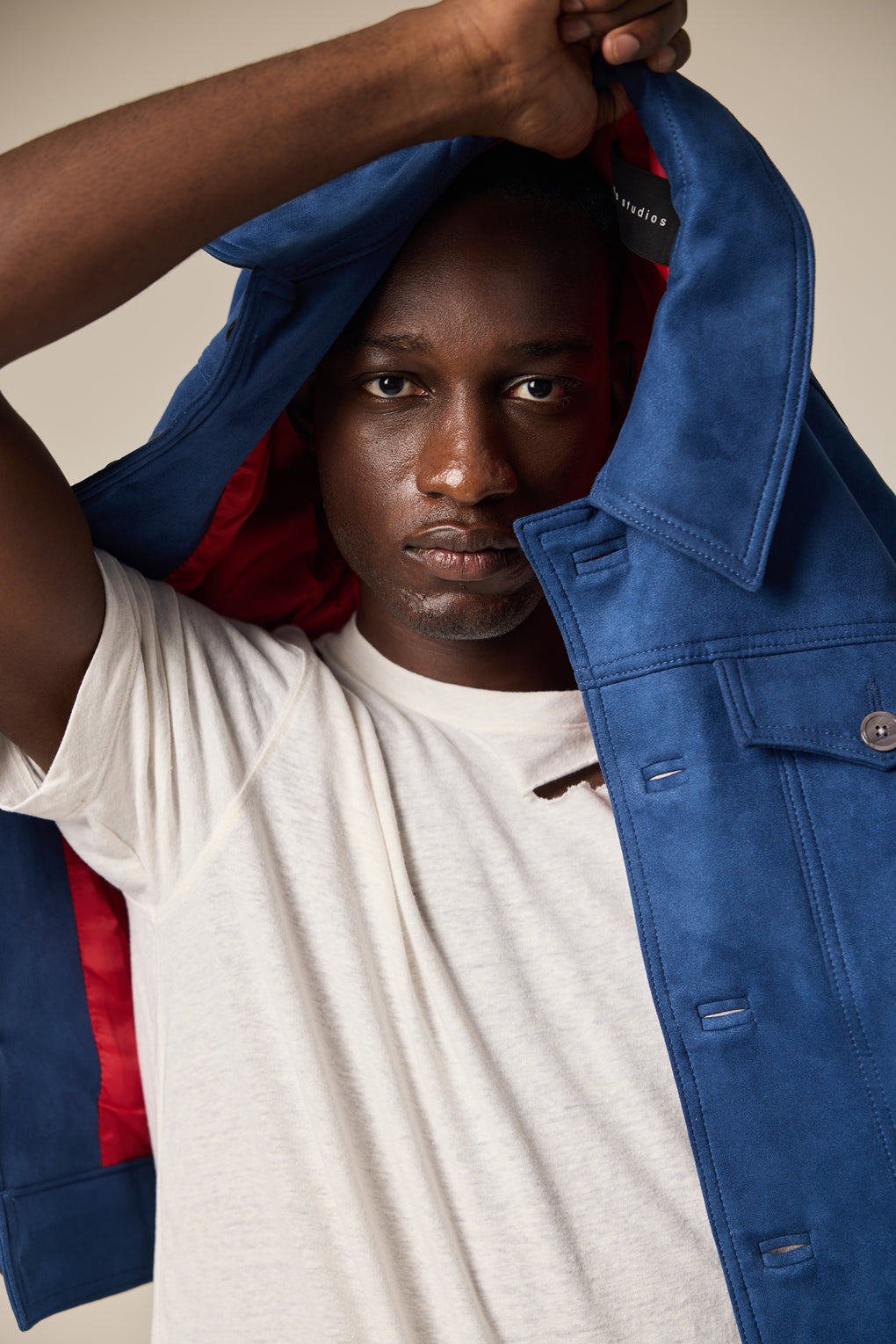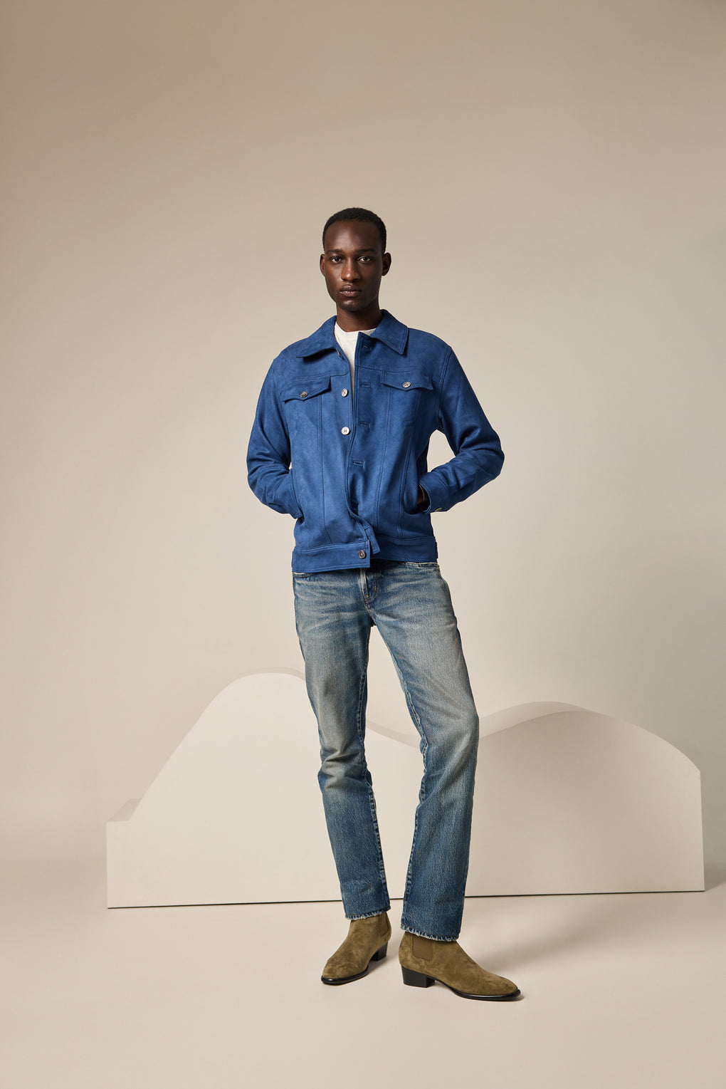 perlo studios' blue suede trucker jacket is detailed with a red inner lining and finished with mop buttons. one size fits all full sleeve regular fit unisex color : blue |