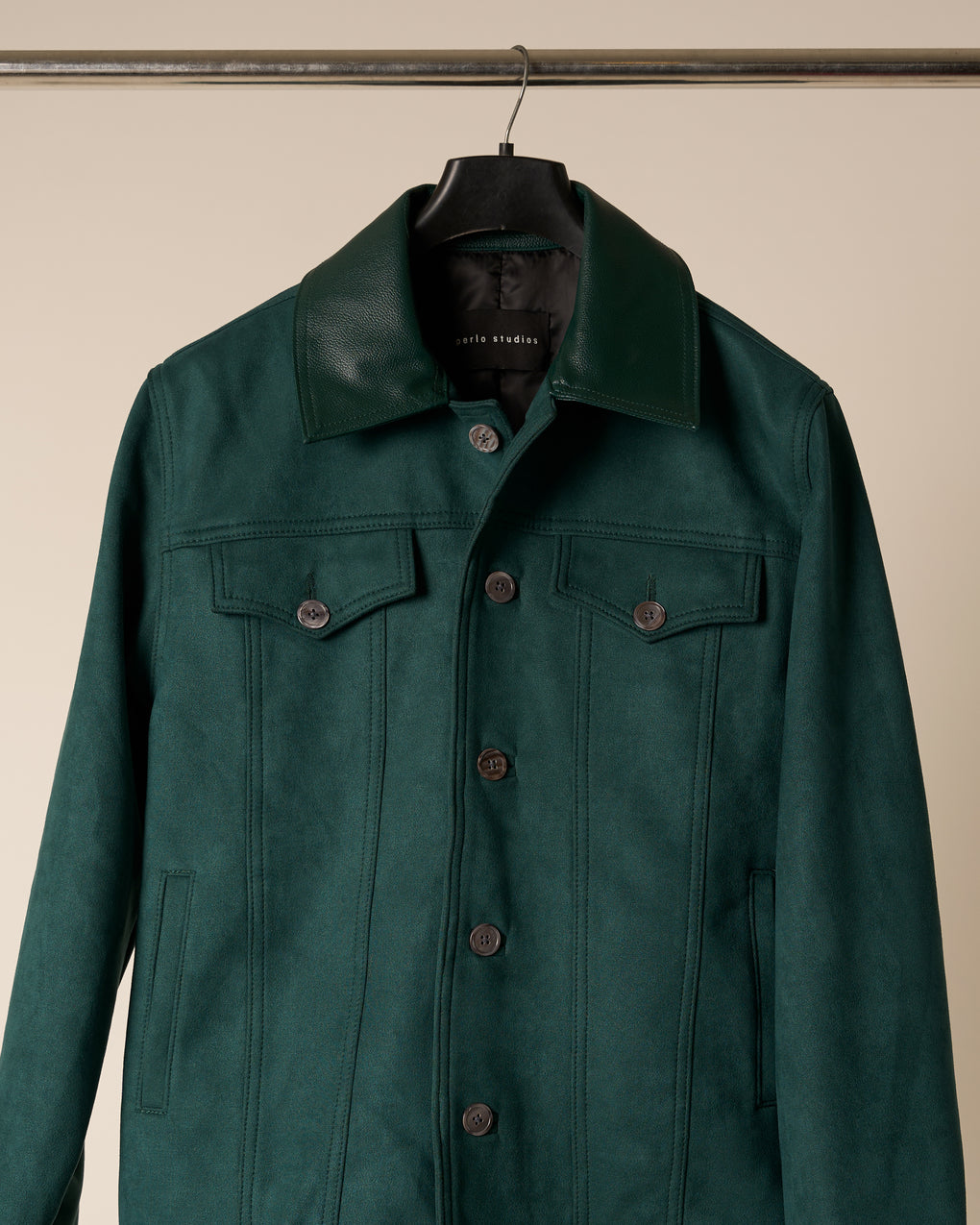 perlo studios' green suede trucker jacket is detailed with a leather collar and finished with mop buttons. one size fits all full sleeve regular fit unisex color : green |
